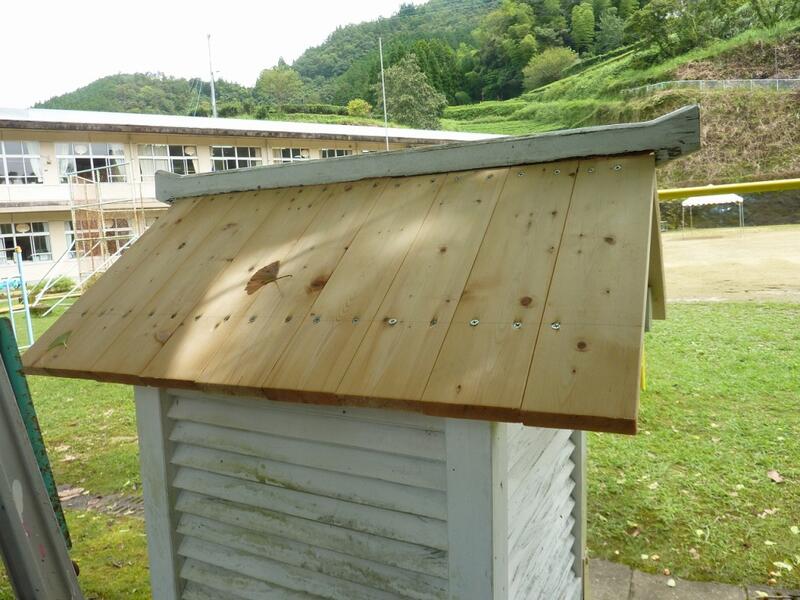 運動場にある百葉箱、当たり前のようにある百葉箱ですが、本校の百葉箱の屋根は雨や風、そして日差しをうけボロボロになっていました。そこで、夏休みに校長先生と教頭先生が百葉箱の屋根を改修してくださいました。おかげで、百葉箱は息を吹き返したかのように存在感を増しています。この後、屋根を白く塗ってくださるそうです。百葉箱のリニューアル、楽しみにしていください。