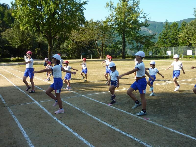 今日の全校体育では、運動会の「ふれあい玉入れ」の入退場の練習と、団技「東海道中膝栗毛」の練習をしました。