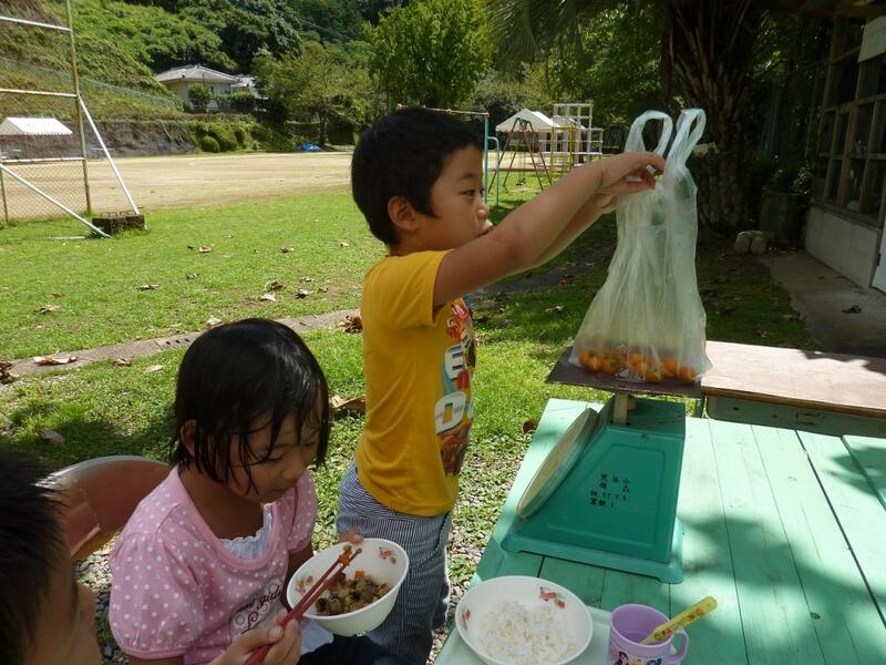 今日の給食は夏野菜カレーでした。この夏野菜カレーにはゴーヤが入ります。そこで、調理員の先生が1・2年生にゴーヤを発注しました。1・2年生はみどりのカーテンを作っており、そこでゴーヤを育てているのです。発注書には「ゴーヤ220グラム おねがいします」と書かれています。これを見た1・2年生は今朝早速ゴーヤを収穫してくれました。そして代表して1年生が調理員の先生にゴーヤを持っていきました。
