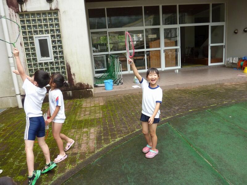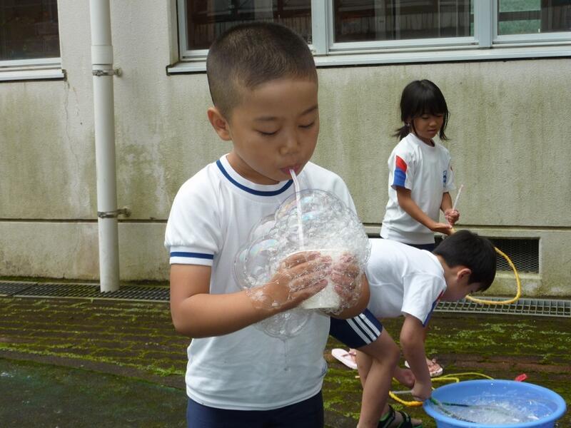 1・2年生は、1~2時間目にシャボン玉を作って遊びました。このシャボン玉の液には水・食器用洗剤・洗濯のり・砂糖・炭酸水が入っているそうです。ハンガーの輪っかにシャボン玉液を浸し、腕を振るとなが~いシャボン玉ができました。このシャボン玉、弾力性があり形を変えながら飛んでいっていました。輪っかは1人1本持っていますが、シャボン玉液は4~5人に1個です。そのため、子どもたちの中でどの順番でシャボン玉液を使うかを話し合ってじゃんけんをしていたり、「○○くんに次させてあげたら」と周りの友達のことを気遣う子どももいました。