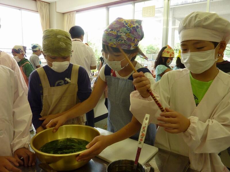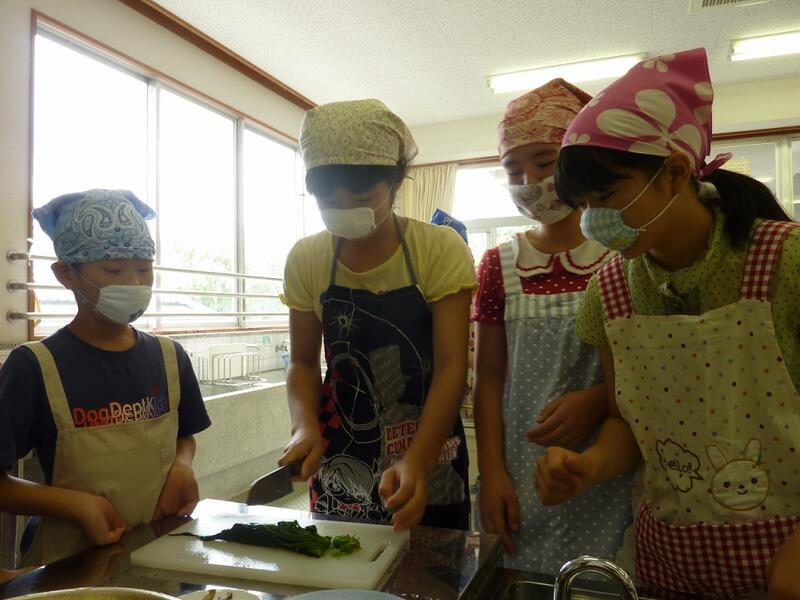 その5・6年生は、3・4時間目に家庭科で調理実習を行いました。今日は、諸塚中の栄養教諭の先生にお越しいただき、地産地消の意味やおみそ汁の作り方を教えていただきました。今日は諸塚の食材を100%使ったおみそ汁を作るのだそうです。ほうれんそう・とうふ・しいたけを使ったおみそ汁。だしは干ししいたけでとり、みそは七ツ山で作られたみそを使用しました。「沸騰する直前にほうれん草を入れるんだって。沸騰する直前ってどんなふうになると?」とグループで相談したり、順番に包丁で食材を切ったりして、無事に諸塚100%のおみそ汁ができあがりました。