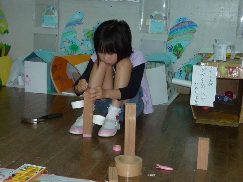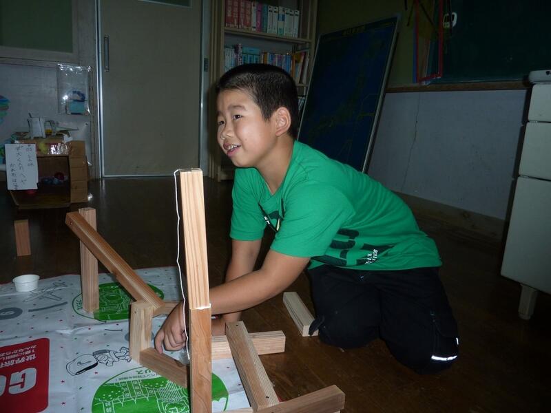 今日は朝から「トントントントン」と2階から金づちを叩くような音がしていました。なんだろう?と不思議に思っていると、3・4年生の担任の先生が職員室に来られて「今、ひよこの遊園地を作ってるんですよ。よかったら見に来てください」と話されました。このひよことはウッジョブ諸塚での取組でわくわくのたまごからかえったひよこのことです。このひよこには家も建てられています。そして、今回はブランコやシーソー、ジェットコースターなどの遊園地を作っているそうです。わくわくのひよこが楽しめるように、そして子どもたちも楽しみながら総合的な学習の時間と図工を関連させた学習をしていました。「かなづちを使ったことある?」と聞くと「4年生は学校ではないけど家であります」と答えていました。3年生は「しいたけのこま打ちの時に使いました」とか「文化祭で使ったことがあります」等と話していました。さすがは4年生、手際良く釘を打っていました。3年生も試行錯誤しながら、わくわくひよこのために一生懸命でした。