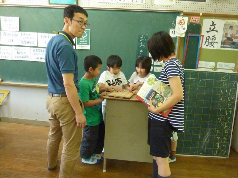 そして、授業の後には観光協会の方が使用されていた木のバインダーに興味をもち、「この木は何歳か数えてみよう。」と言って年輪を数えている子どももいました。
