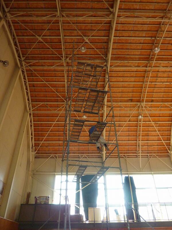本日、体育館の照明の交換に業者の方が来てくださいました。交換する照明は体育館の中でも一番高い場所にある照明です。外も暑いですが体育館の中も暑いこの時期に、足場を組んで、高いところに登って交換をしてくださいました。汗びっしょりになって一生懸命作業をしてくださったおかげで、体育館がまた使いやすくなります。ありがとうございました。