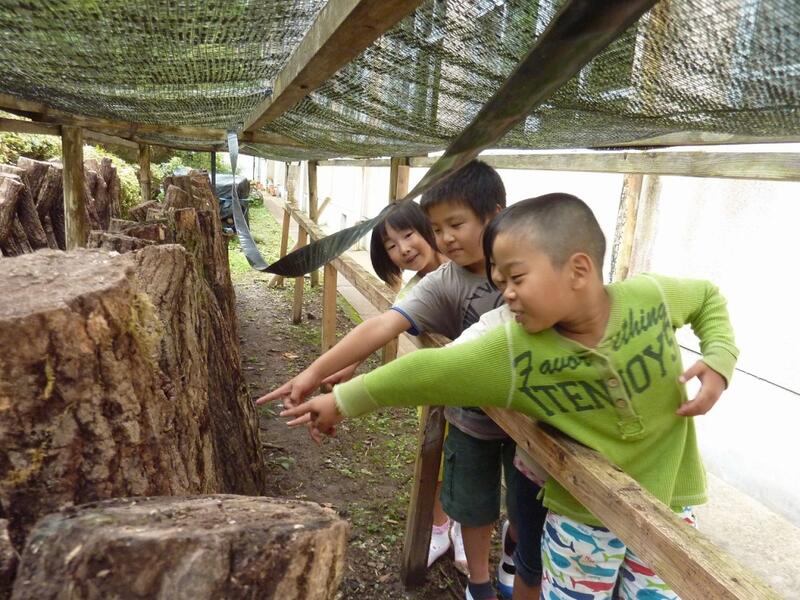 シルバーウィークが終わり、学校に来るとキンモクセイの香りが職員室まで届いてきていました。秋を感じるなぁと思っていると、9月25日金曜日、「しいたけが出てる!!」と2年生の声。その声を合図に他の1・2年生もしいたけ置き場にやってきました。すると1本のなば木から、たくさんのしいたけがにょきにょきと顔を出していました。