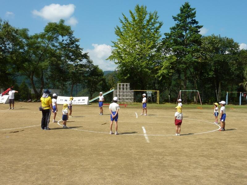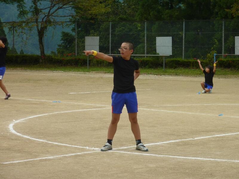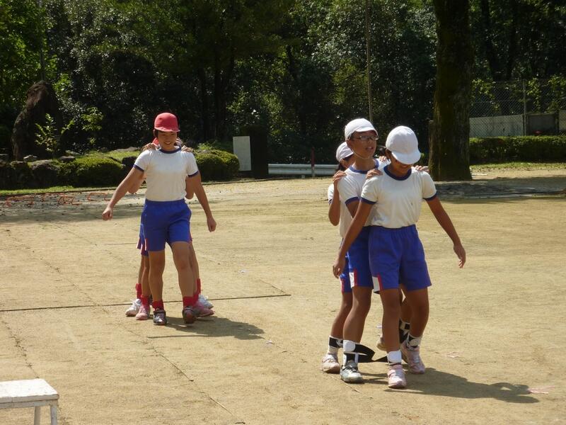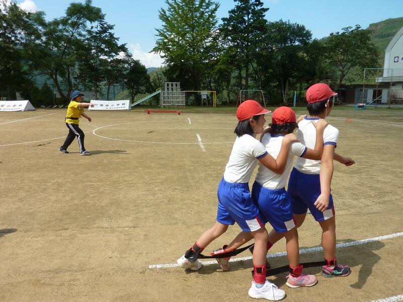 団技は1年生が平行棒に登ったり、タイヤを運んだりします。その後、3~5年生は二人三脚、最後に5・6年生でムカデ競走をします。5・6年生のムカデ競走では、「しいたけ しいたけ 乾燥しいたけ なば」と掛け声をかけながら進んでいっていました。この掛け声、去年も聞いたような・・・。そこで、給食時間に子どもたちに聞くと「中学校の部活動紹介で中学生が言ってたんです」と話していました。この掛け声、リズムを取りやすいそうです。