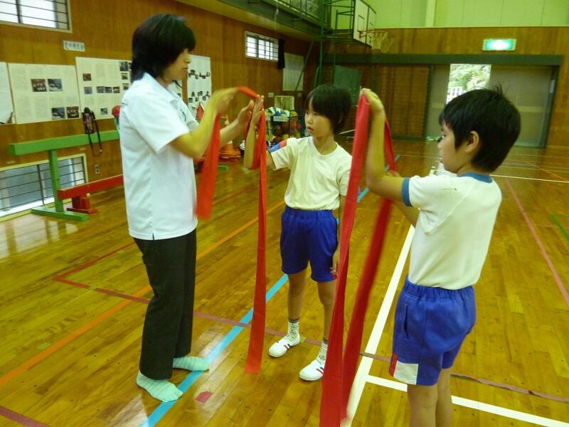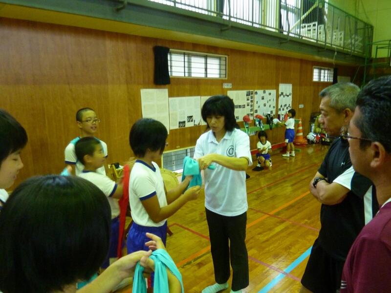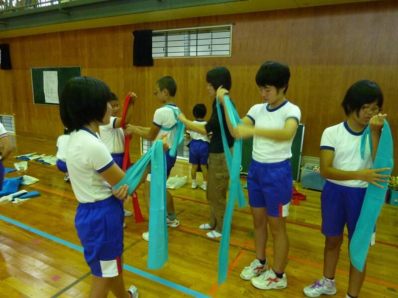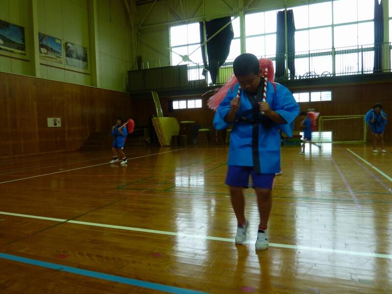 昨日の運動会予行練習の反省を受けて、今日の朝の時間から1時間目は神楽の練習を行いました。朝の時間には衣装合わせをしました。青いハッピにたすきを掛けるのですが、子どもたちも職員もたすきの結び方がうろ覚えです。昨年度は給食調理員の先生に教えていただいたので、今年度も給食調理員の先生に急遽お越しいただき、たすきの結び方をご指導いただきました。