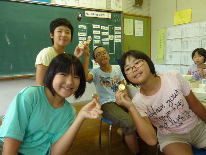 その後、なんとALTの先生からカナダのおみやげをいただきました。とってもめずらしいお金の形をしたチョコです。そのデザインに子どもたちは興味津々。腕に載せて「時計みたいやろ!出ろ!妖怪!!」と言っていたり、「このチョコレート大人の味がします」と感想を言ったりしていました。今日はたくさんの先生が荒谷小に来てくださり、給食が一品増え、おみやげまでもらってスペシャルな一日でしたね。