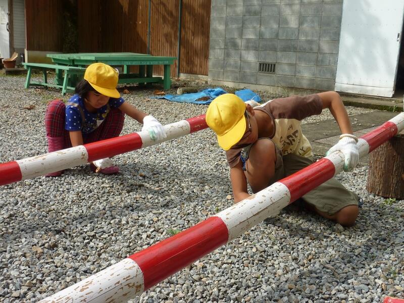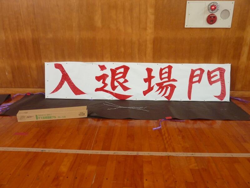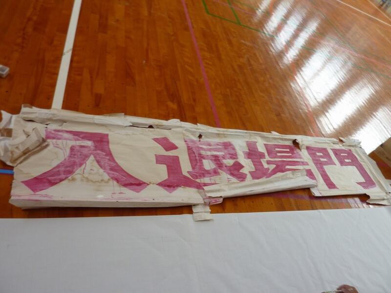 1・2年生は、はちまきや旗を洗濯して干しました。3・4年生は神楽で使用したハッピをたたんだり、リレーのバトン等の片づけ、5・6年生は看板等を体育館に片付けました。今回の運動会で、入退場門の看板が老朽化していること、またそれを支える柱のペンキも剥げていることが分かり、新しく作りかえることにしました。早速5・6年生が片付けの時間にペンキを持ってきて、柱をきれいに塗ってくれました。途中、ズボンに白いペンキが付くというハプニングもありましたが、それをも楽しく笑い飛ばし、みんなで手分けしながら一生懸命塗ってくれました。看板は5・6年生担任の先生が作成してくださいました。