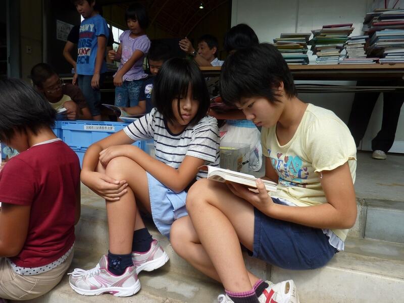 【5・6年生は最後にやまびこ号に入るので、それまで外で読書を楽しんでいます】