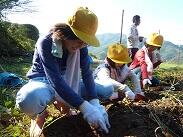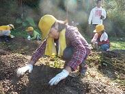 一生懸命植えていると色々な発見があるようで、土を掘り返すとサツマイモがでてきたり、アナグマが花を掘り返している痕跡を見つけたりしていました。