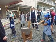 午後からはもちつき大会です。この日のために保護者の皆様は前日からお手伝いに来てくださっていました。当日も臼を運んだり、火を炊いたりして、もちつき大会に備えてたくさんの準備をしてくださいました。