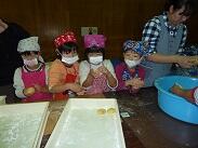 体育館の中では、お母さん方と子どもたちでおもちを丸めていました。小学生が保育所生に丸め方を教えてくれて、色々な形のおもちが出来上がりました。