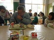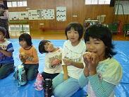 待ちに待った試食の時間、家庭教育学級長さんが毎年持ってきてくださるきゅうりの漬け物を中心に、子どもたちの円ができました。あんこが入ったおもちを選ぶ子、ピンクのおもちを選ぶ子等、自分の食べたいおもちを選びみんなで「いただきます」をしました。つきたてのおもちはとってもおいしくて、あっという間に子どもたちのお腹の中に入っていました。まだ余力がありそうな子どもたちを見て、家庭教育学級長さんが「まだ食べたい人?」と聞いてくださり、なんとおかわりができました。嬉しそうにおもちまで駆け寄る子どもたち。2つめのおもちもぱくぱく食べて大満足の様子でした。