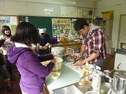 という目標をそれぞれ発表していました。その後、子どもたちのウッジョブ諸塚での活動を発表し、いよいよランチルームでの昼食です。昼食にはほかほかのおにぎり、つけもの、にしめ、猪汁、みそ等のたくさんの料理が並んでいました。ツアーの主催者である児童のおばあちゃんやお父さんも準備を手伝ってくださり、おばあちゃん特製にしめには、肉厚のしいたけやぜんまいがあり、とってもおいしかったです。お父さん担当の猪汁にはたくさんの猪肉や野菜が入っていて「買ったのはとうふくらいです」と話されていました。それ以外の具材は自家製の野菜のようです。諸塚の食材で作られたお昼ごはんを食べながら、子どもたちも大学生と次第に打ち解けて話をしていました。