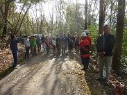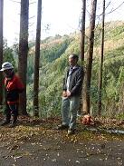 その後、伐採現場に移動です。荒谷小学校から10分ほどの場所に地元の林業会社の方々が待っていてくださいました。まずは社長さんからお話がありました。今回伐採する木は植林してから40年~50年経ったものだそうです。大きな木を切るところを初めて見るツアーの参加者の方々は目をキラキラさせていました。