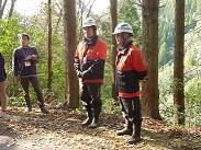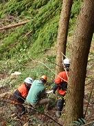 ヘルメットをかぶって、伐採現場の見学です。受け口を切り、追い口を切って、くさびを入れるという、以前森林体験学習で見せていただいた伐採現場の時と同じような手順で進められました。くさびをとんとん叩いていくうちに、大きなきが少しずつ傾きどしーんと地面に倒れていきました。大きな音ですが、山に吸い込まれるようなやわらかい音です。1本の木の伐採が終わると拍手の音で伐採現場が包まれました。何本か伐採をした後、特別にツアーの参加者の1人に伐採の体験をさせてもらえることになりました。初めてする伐採に手が震えたそうです。