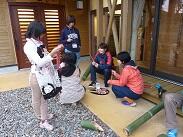 伐採現場見学の後は、諸塚村の黒原(くろばる)にある「よしや」に移動して、夕食の準備をしました。そこでは竹を切って串をつくり、猪肉やピーマンを刺していろりで焼く準備をしたり、かまどでごはんを炊いたり、猪鍋を作ったりしました。