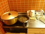 夕方になると、ハチ料理の名人もきてくださいました。周りの方からは「シェフ」と呼ばれるほどの腕前だそうです。大量のハチを素揚げしてくださいました。また、ハチそうめん担当の方も大きな鍋にハチや野菜、そうめんを入れてことこと煮込んでくださいました。