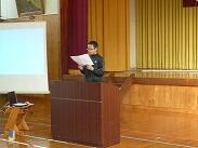 その後、代表児童(6年生)が作文を読みました。この児童は「切磋琢磨」、「コミュニケーション」という視点でまとめていました。「切磋琢磨」では、昨日の自分と戦う、ライバルをつくる等、自分の中で常に目標を掲げて様々な活動に取り組んだようでした。「コミュニケーション」では、ウッジョブなどの取材を通して相手の考えを引き出すような会話ができたそうです。「もしかしたら、アナウンサーになれるかも・・」という自分の新たな一面も見つけることができたと発表していました。