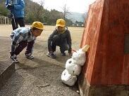 2年生が、下に落ちている石を拾ってオラフの目ができ上がりました。オラフが見守る中、1・2年生は運動場を走ったり写真を撮ったりして、雪と仲良くなっていました。