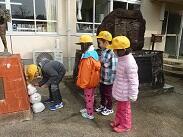 今日は朝から雪が降っていて、朝はうっすらと雪が積もっていました。久しぶりに見る雪に子どもたちは大喜びです。休み時間には外に出て、雪とたわむれている子どもたちもいました。運動場にある二宮金次郎の像の下には、3段の雪だるまが飾ってありました。