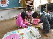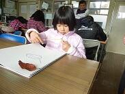 おとなりの1・2年生は、凧に絵をかいているところでした。うさぎやさるなどを大きくかいていて、空に浮かんでもハッキリと見えそうな凧ができていました。
