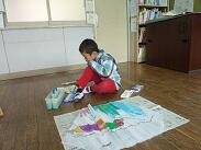 【2年生が1年生の手伝いをしていました】【カラフルなサメがかいている凧制作中】