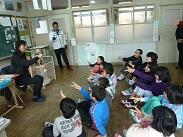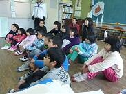 2冊目は「いくらなんでもいくらくん」という絵本です。何でも屋の主人の「いくらくん」、冬にお殿様に呼ばれ、「何でも屋ならブドウを出してみろ」とか「桜が見たい」等と難しい要求をされます。それでも「いくらくん」はお殿様相手に「あいよ」、「まあね」など素っ気ない言葉を返し、いくらで作ったブドウを出したり、いくらで作った桜を見せ、王様を満足させていました。「いくらくん」がいない生活は考えられない王様と「いくらくん」の行く末は・・・。読み聞かせをする先生の口調や間合いがこの本にとっても合っていて、笑いが耐えない読み聞かせの時間になりました。「あ~面白かった」と言いながら教室に帰っていく子どもたちでした。