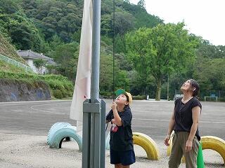 「君が代」に合わせてタイミング良く掲揚(降納)ができるよう、2年生と担任の先生、校長先生の歌に合わせて何度も練習をしていました。
