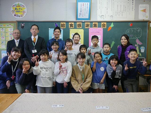 荒谷小学校の給食に携わってくださっている方々に感謝の気持ちを伝える給食感謝集会を行いました。22日(木)は、諸塚中学校の栄養教諭の先生、23日(金)は調理員さんと野菜や牛乳を配達して下さる地域の方にお越しいただきました。