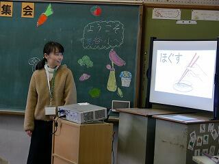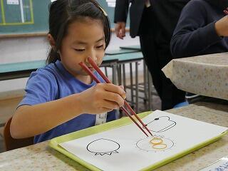栄養教諭の先生には「お箸の持ち方」についてもご指導いただきました。正しく持つと「はがす」や「ほぐす」などお箸でできることが増えることを教えていただき、実際にスポンジやマカロニで練習をしました。授業後の給食では、早速正しいお箸の持ち方をチャレンジしていました。