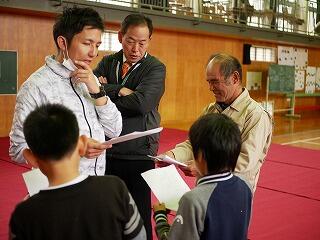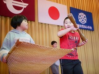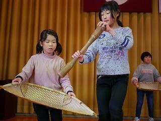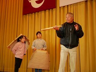 南川地区で代々受け継がれている伝統芸能の「箕舞(みいまい)」。毎年、荒谷小学校では学習発表会でこの「箕舞」を披露しています。この日は、「箕舞保存会」の方々3名にお越しいただき、舞い方や唄い方を教えていただきました。