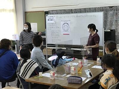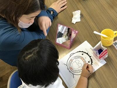 「歯磨き教室」では、太田歯科医院の歯科衛生士さんをお招きし、染め出し・仕上げ磨き実践、正しい歯の磨き方について、親子で学習しました。
