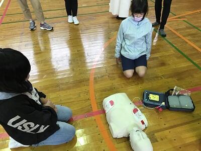 また、心肺蘇生講習会では、5年生の児童と保護者、先生方で講習会受けました。