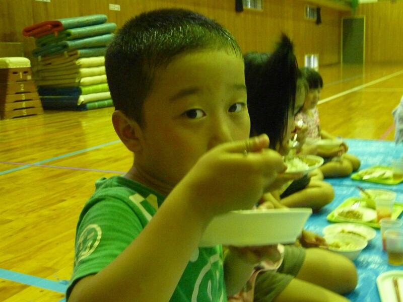 何度もバットがスイカに命中したのですが、なかなかスイカは割れませんでした。しかし、高学年が勢いよくスイカを叩くとヒビが入り、中から赤い果肉が見えてきました。スイカ割りの後はみんなでおいしくスイカをいただきました。種を飛ばしたり、手で種を取ったり、種を飲み込んだり、色々な食べ方をしていました。
