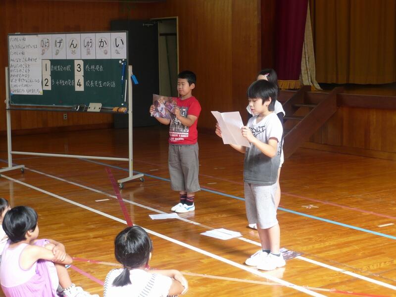 それから作文発表がありました。発表は5年生と6年生1名ずつ行いました。その内容は、5年生が植林体験のこと、6年生は諸塚の林業のことでした。5年生は植林体験の時に「できるかなぁ、大丈夫かなぁ」と不安だった気持ちが、講師の先生のアドバイスに勇気をもらい植林をできたことやその講師の方への思い、林業に携わる方々の苦労や工夫についてまとめていました。校長先生からは「この作文を読んだら講師の先生や地域の方々は感動されて泣かれるかもしれませんね」と、子どもの植林体験から林業に携わる方々への思いを作文に表現した5年生にお誉めの言葉をかけてくださいました。