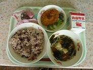 今日の給食は入学・進級お祝いメニューでした。献立は、赤飯・若竹汁・ロースカツ・ブロッコリーのごまあえ・牛乳・お祝いデザートです。