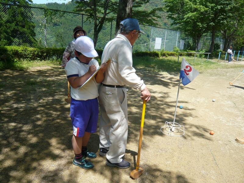その後、9つにチームを分けて早速グランドゴルフのスタートです。チームは子どもが1~2名と寿会の方々が3~4名入って1チーム4~5名になりました。「棒に当たるように打つといいが」、「ちーっとはばしかったね」、「足らん、足らん」、「こんだ、入るわ。入りいいとこにあるから」等、寿会の方々が子どもたちにアドバイスをしながらゲームを進めていってくださいました。