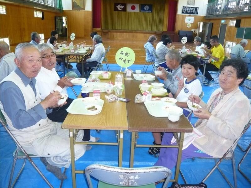 お昼は、体育館でみんなで給食を食べました。ここでも「昔は上の方に保育所があったとよ。そこまで歩いて行きよったがね」、「○○くんのお父さんは荒谷小に通っちょった頃ね、体育と給食が一番好きって言いよったわ」等、寿会の方々が子どもたちにお話をしてくださりながら、和やかな給食の時間を過ごしました。