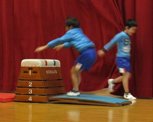 体育振興指導教諭の村中田先生から教えていただいた開脚跳び、閉脚跳びも披露しました。