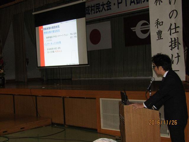 引き続き行われた村P大会では、本校の内村教諭が「情報化社会を生き抜く子どもの育成」というテーマで教職員を代表して意見発表を行いました。