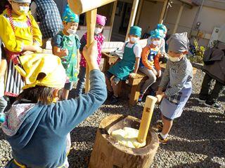 干し柿完成後は、子どもたちがおじいちゃん、おばあちゃんのために餅をつき、おばあちゃんたちに教えていただきながら餅を丸めました。