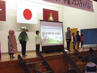 その後、体育館で行われた5・6年生の発表では、「くぬぎ地蔵」について発表しました。説明あり、クイズあり、キャラクターの登場ありと、見ている人を飽きさせない工夫がされていました。
