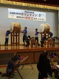 11月27日(日)に県北地区ボランティア研修会が本村の中央公民館で行われ、本校の児童がオープニングセレモニーで「七ツ山太鼓」を披露しました。