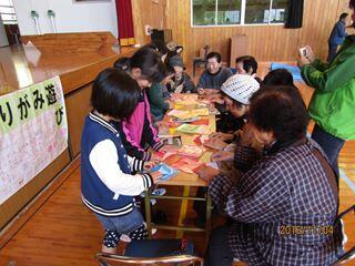 楽しい会食後には、折り紙、空気鉄砲、チラシ工作の3つに分かれ、寿会のおじいちゃん、おばあちゃんに教えてもらいながら作ったり、作った物で遊んだりしました。