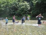 奉仕作業後は、七小伝統の「魚のつかみ取り大会」があり、活きのいい150匹の鮎が放たれました。天気もよかったので、水の中で幼児から大人まで楽しんでいました。