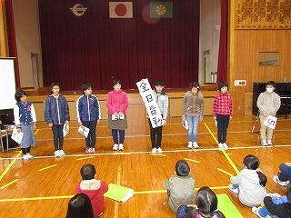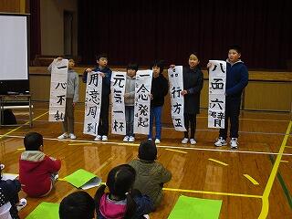 1・2年生は、画用紙にマジックとクレヨンで、3年生以上は、条幅紙に毛筆で書いた新年の抱負をみんなに見せながら発表しました。発表の仕方は、1・2年生は、自分の今までの生活を振り返った上で、最後に「ていねいに」「わすれものゼロ」「かきじゅん」など、自分ががんばることを発表しました。3・4年生は、それに加えて自分が選んだ「一心不乱」「一念発起」「八面六臂」などの四字熟語の意味も説明をしました。5・6年生は、同じ4文字でも「全日皆勤」「決意継続」「克己忍耐」など、自分でつくった四字熟語で決意を表しました。