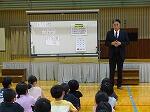 続いて行われた一学期の始業式では、田爪校長先生から、「『あいさつ』のできる子ども」「『おしえて』といえる子ども」「『チャレンジ』する子ども」という3つの目指す児童像の話がありました。校長先生の話に続き、3名の先生から学習面、生活面、保健面での話がありました。