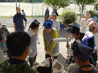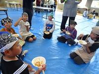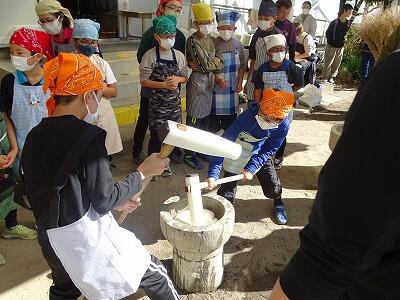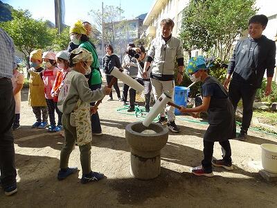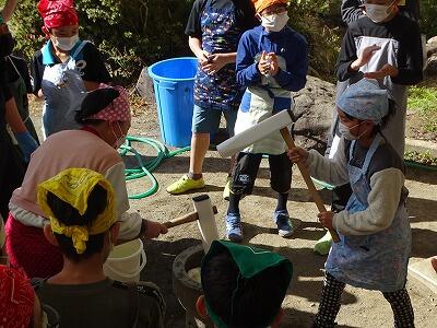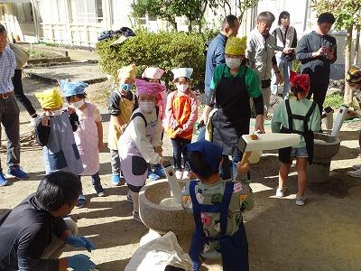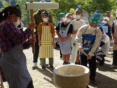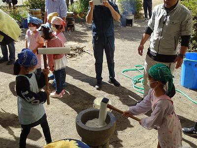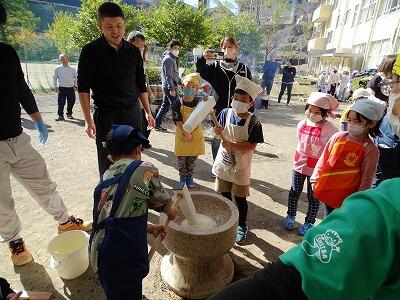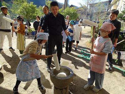 様子を見ていると、子どもと保護者が一緒になってひえつき節を歌いながら餅つきしたり、保護者にきなこ餅を作ってもらい5つを平らげたり、事務室の先生に子どもがきなこ餅を運んでいたりと、参加者の皆さんが、おなかも心も満たされた幸せな秋の一時でした。